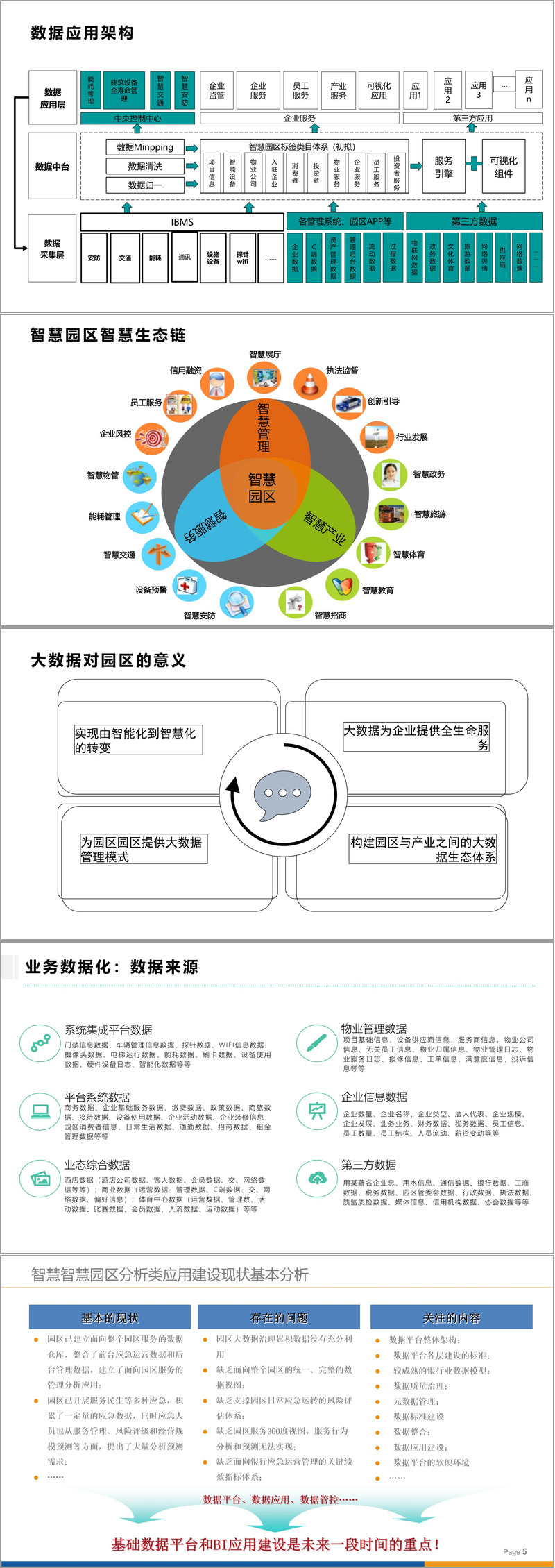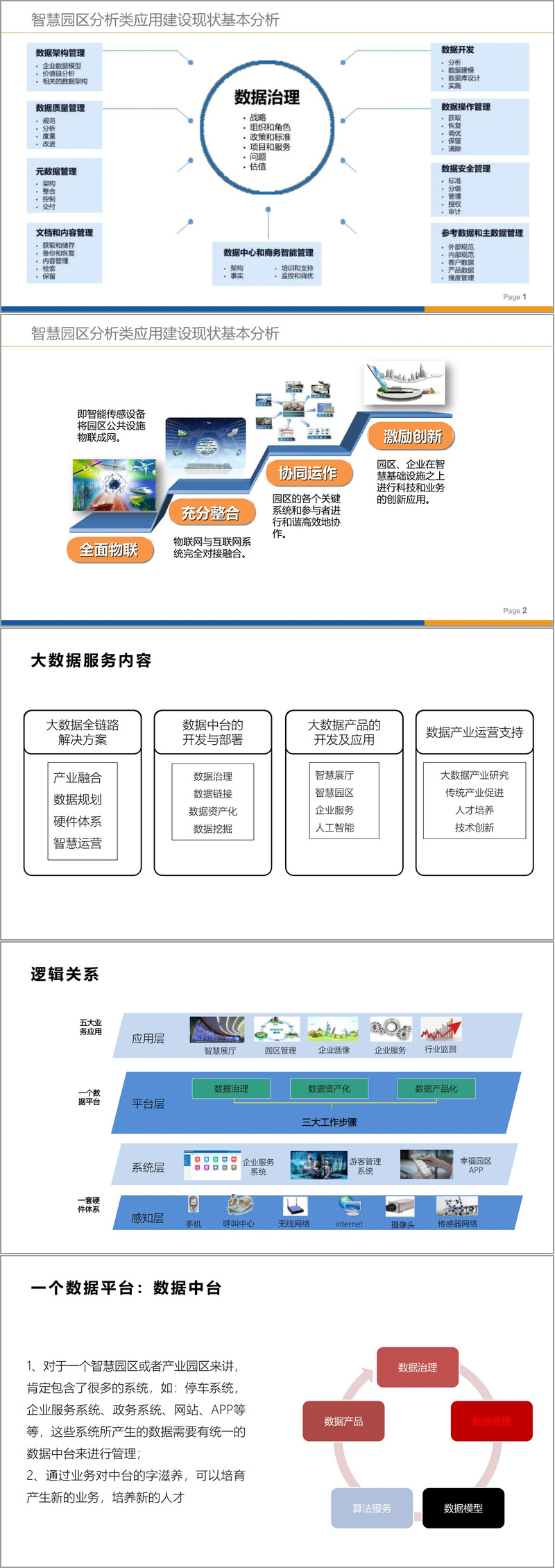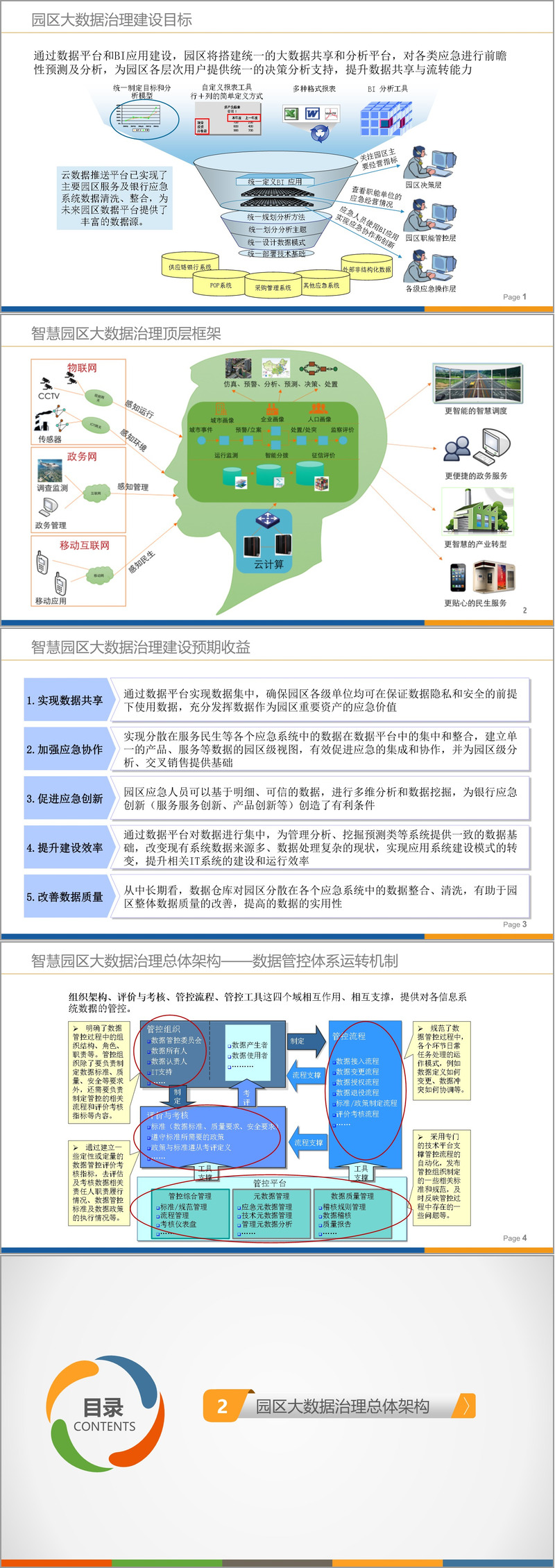 在园区大数据治理综述部分,方案首先明确智慧园区的核心定位 —— 以物联网、云计算、大数据等技术为基础,融合智慧管理、智慧产业、智慧民生三大工程。但当前园区建设存在数据分散难管理、标准缺失、质量参差、应用重复投入等问题,例如缺乏统一数据视图与风险评估体系,关键业务数据缺失且指标口径不一。为此,方案提出大数据治理的核心目标:搭建统一共享分析平台,实现数据资产化,支撑园区决策、企业全生命周期服务及产业生态构建,其数据来源覆盖系统集成、平台系统、业态综合、物业管理、企业信息及第三方数据六大类,确保数据全面性。