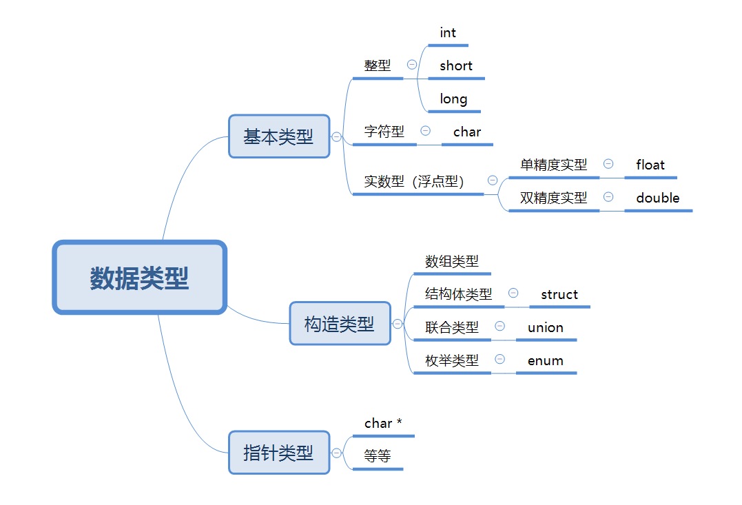 C语言的基本数据类型为:整型、字符型、实数型。这些类型按其在计算机中的存储方式可被分为两个系列,即整数(integer)类型和浮点数(floating-point)类型。