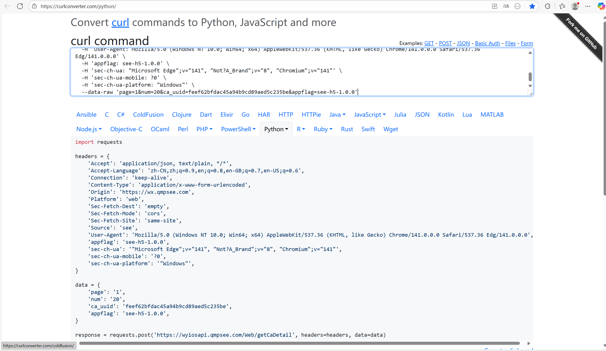 并且,在锁定文件后,我们可以构建基础的爬虫代码。为了方便,在此使用在线工具:Convert curl commands to Python构建基础的python代码。我们只需要将:
