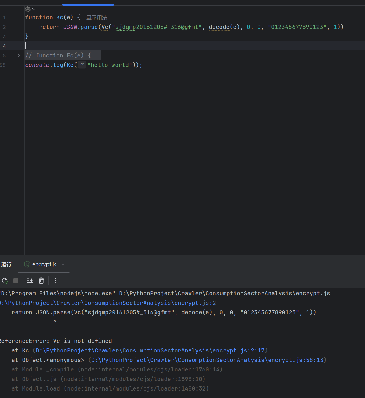 那么,下一步就是调试JS代码看能不能成功了。在PyCharm创建JS文件,输入Kc函数和输出语句(不能运行的下载Node.js插件):