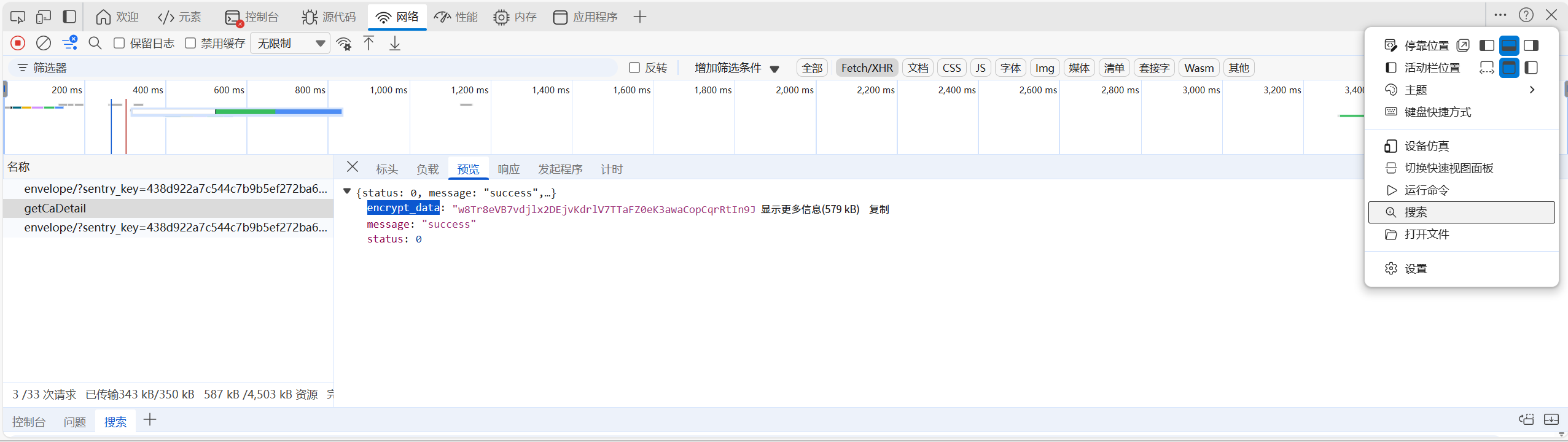 通过对数据值进行观察,我们人类完全看不懂,因此推测可能是加密后的数据。那么我们怎么知道它的加密方式呢?这个时候就需要用到【JS逆向】技术了。