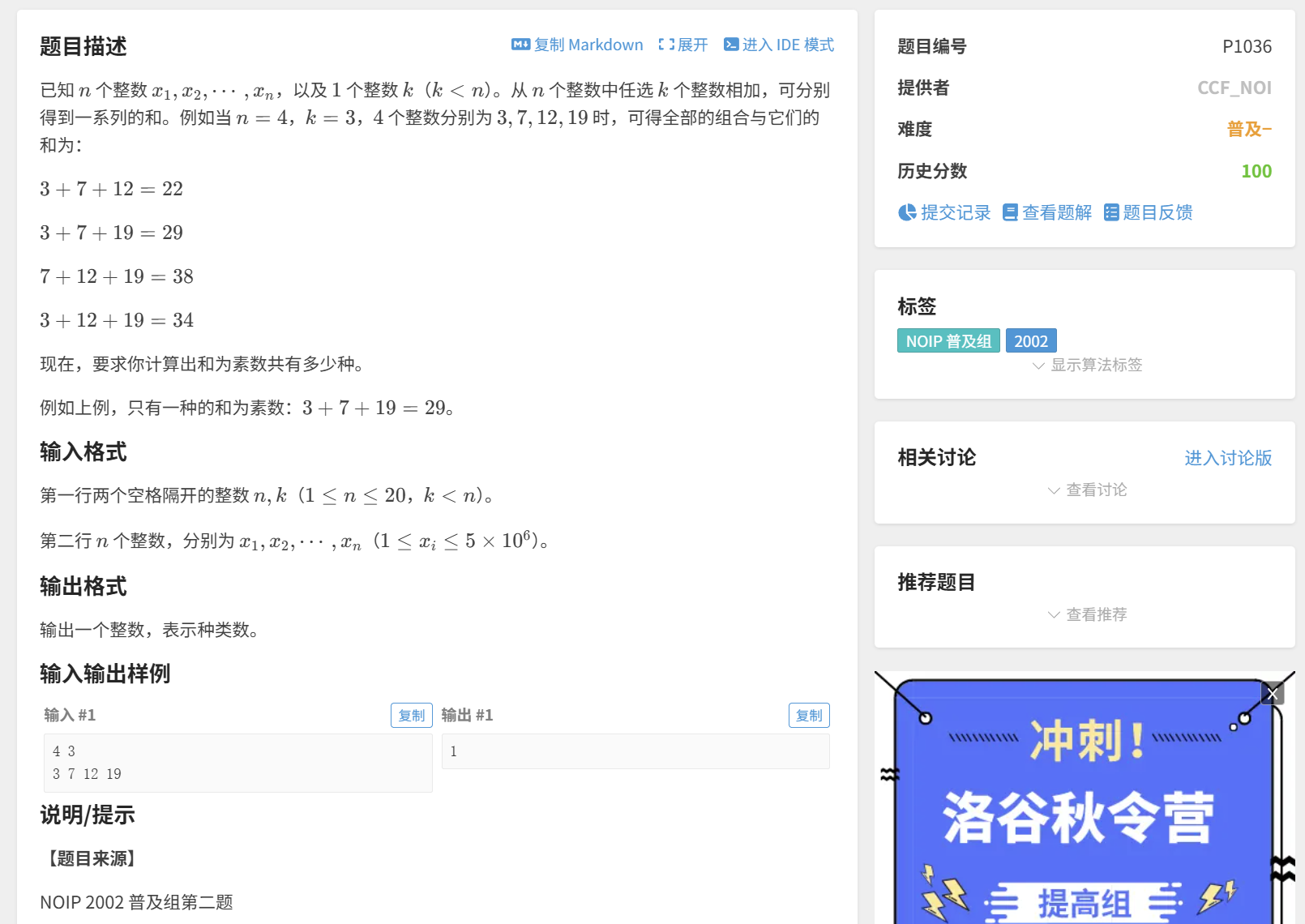 2、深度优先搜索的编码——以洛谷P1036 选数为例