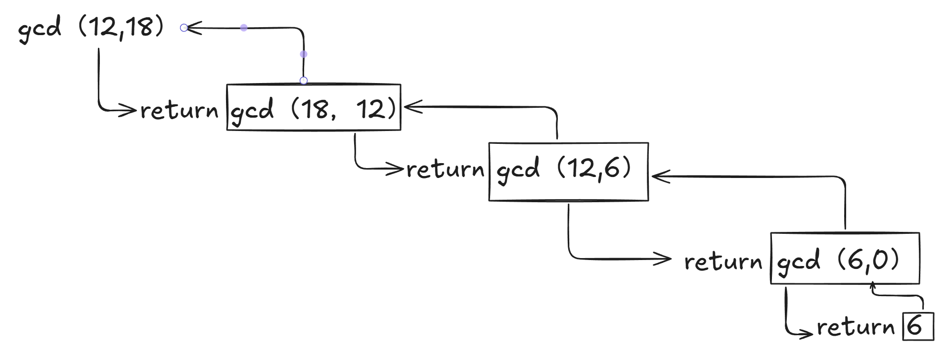 int gcd(int a, int b) {if (b == 0) return a;        // 递归出口return gcd(b, a % b);        // 递归调用