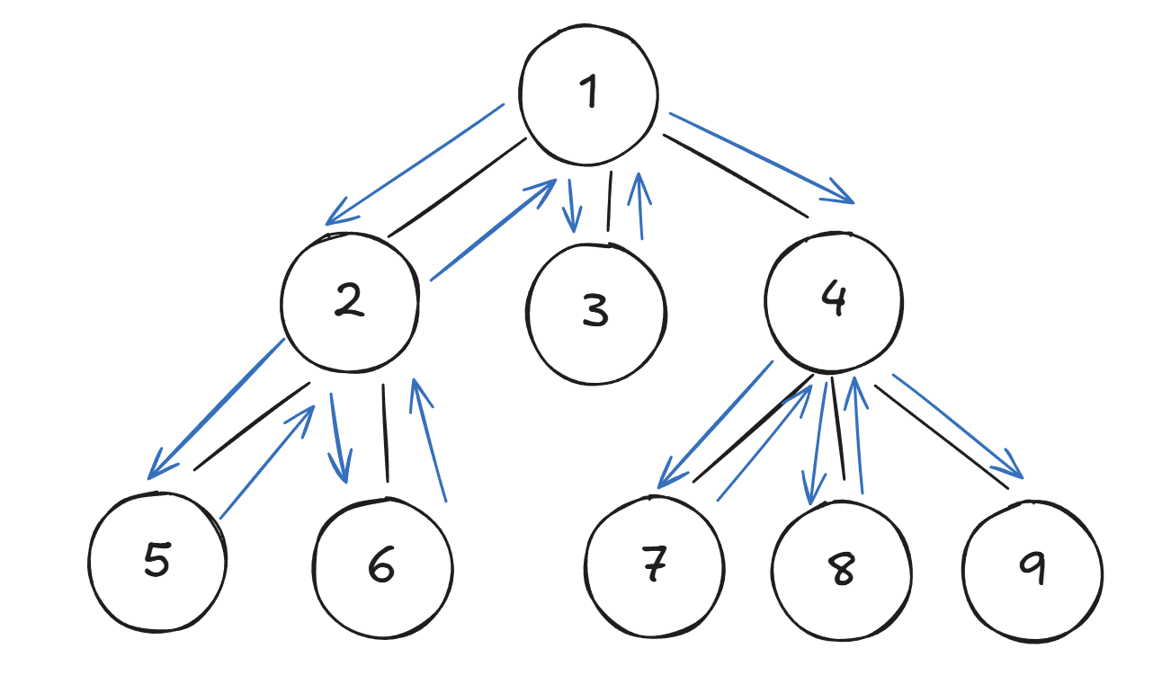 如上图所示,从根节点1开始DFS,先抵达了节点1,虽然它还有3和4两个同级的节点,但是它会沿着这条路径继续走到节点5,此时节点5没有能走的路径了,那就会回溯到节点2,也就是从哪儿来回哪儿去,回退到节点2,重新搜索。