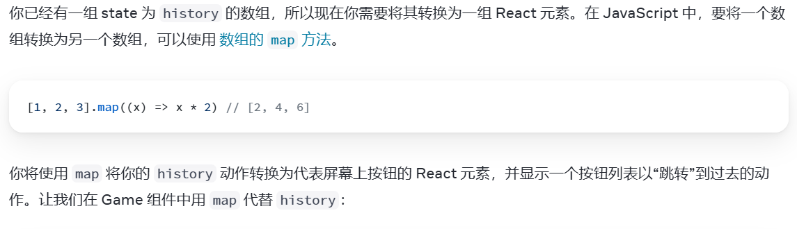 在 React 里,我们需要把 “数据(比如 history 数组里的游戏步骤)” 转换成 “UI 元素(比如按钮)”。map 就是实现这种 “数据 → UI” 转换的核心工具。