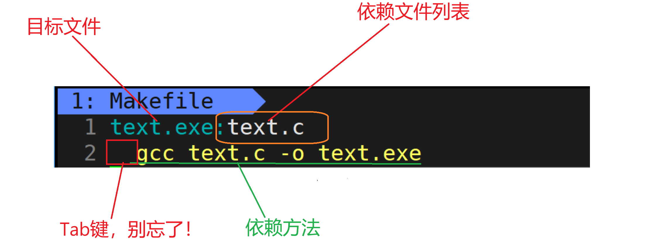 - 命令:生成目标的具体操作(如编译命令 gcc -c),必须以 Tab 键开头(不能用空格,否则报错)。