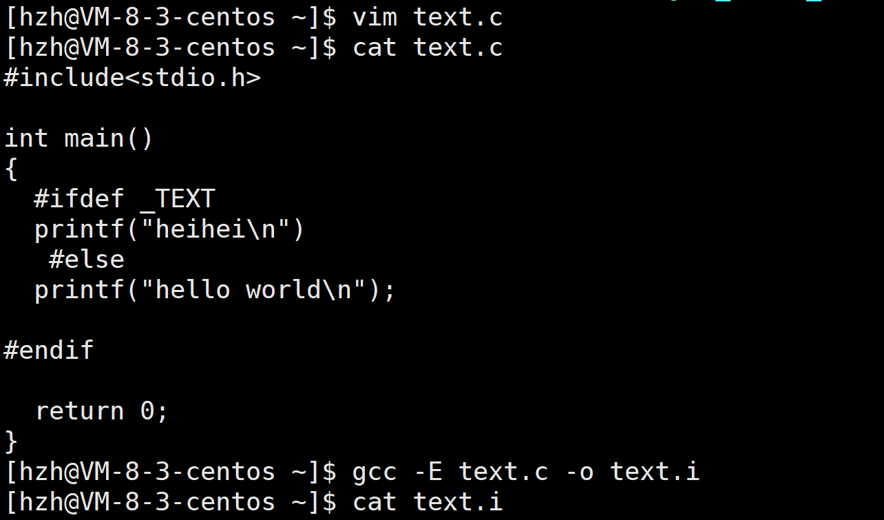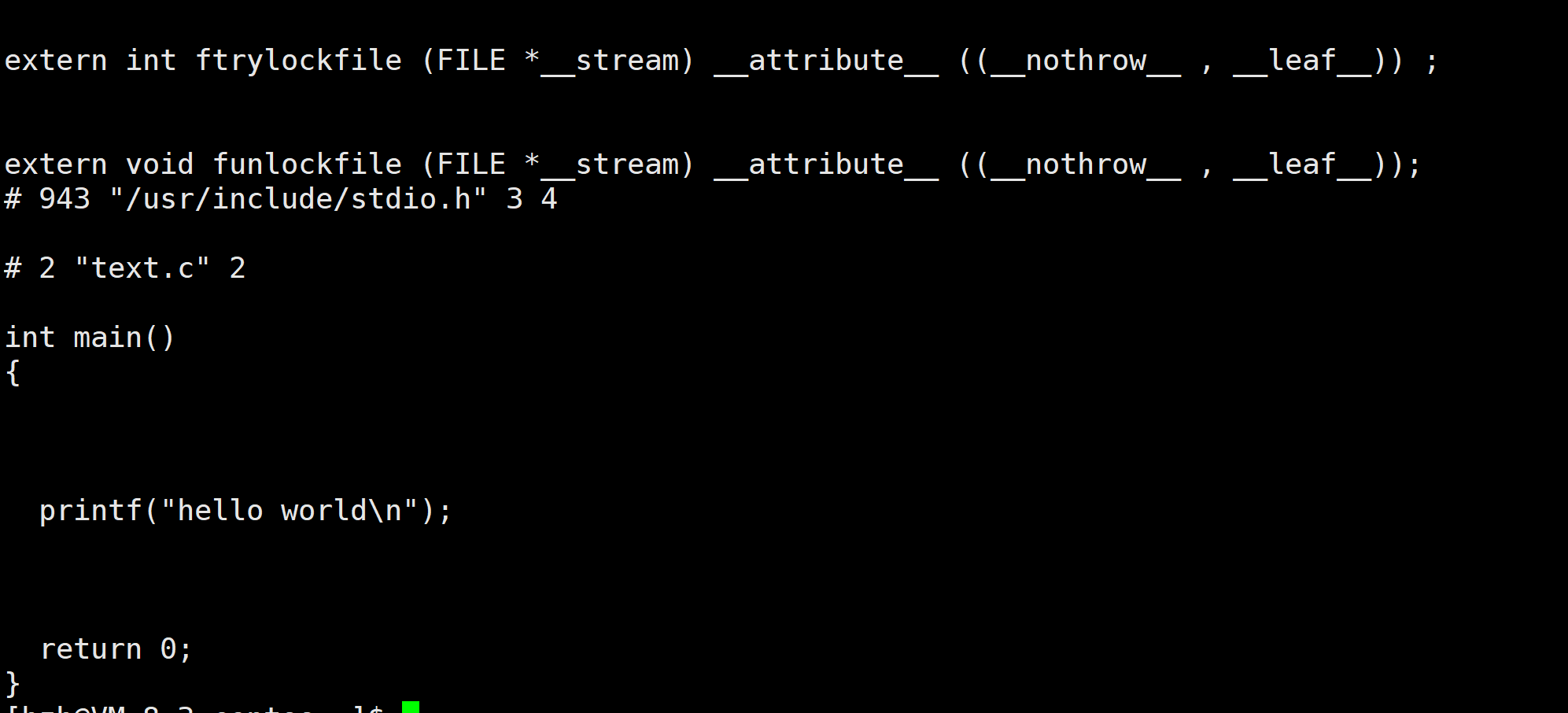 选项“-o”是指目标文件,“.i”文件为已经过预处理的C原始程序。 下面是cat  text.i的一部分,头文件已经被展开: