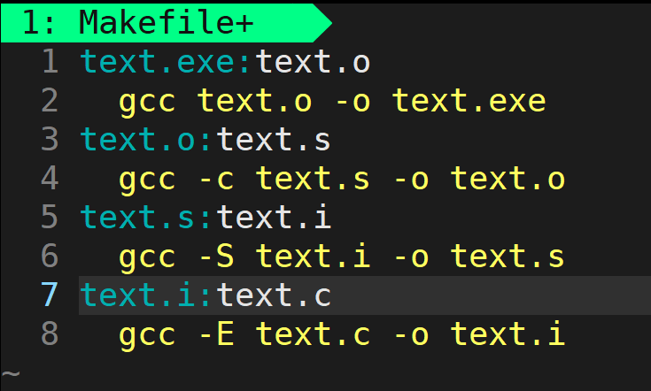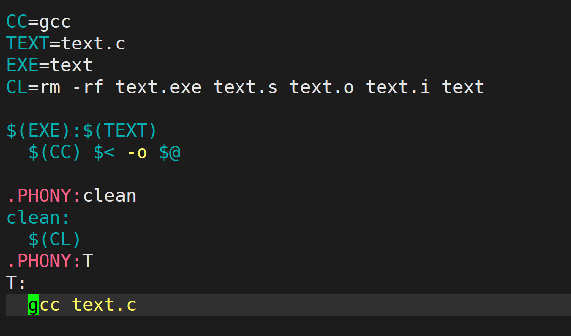在上面的Makefile文件中,text.exe是目标文件,:后面的text.c是依赖文件。下一行Tab键后面的指令就是依赖方法。