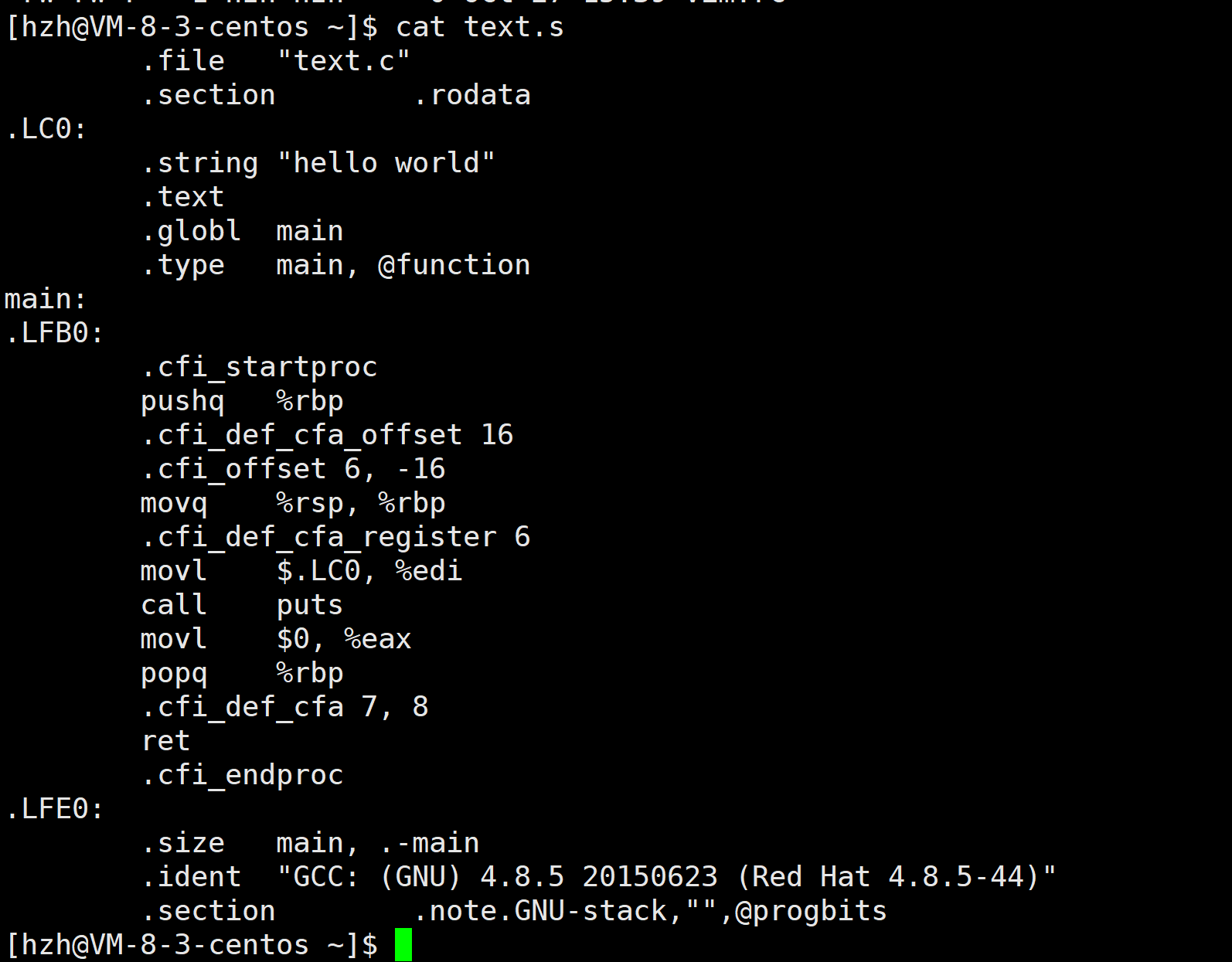 选项“-S”,该选项的作用是让gcc在编译到汇编语言阶段结束后停止编译过程。(生成文件后缀推荐使用.s)