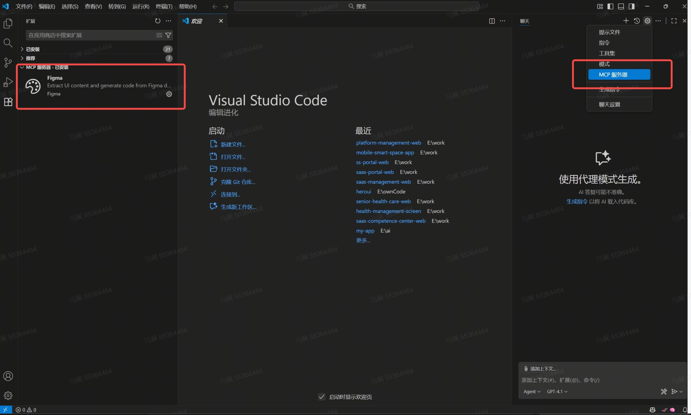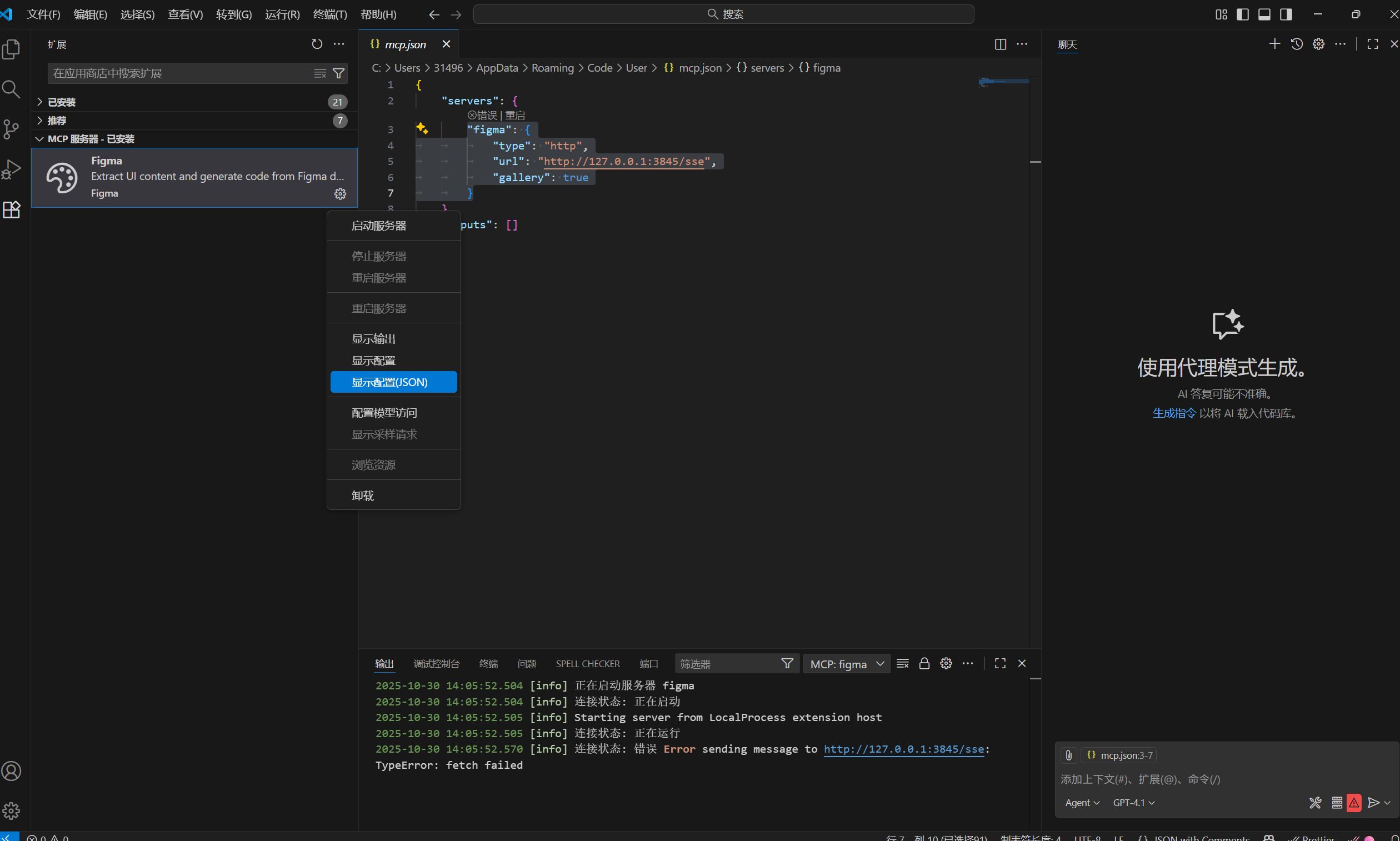 提示词中@你的figma地址 ,即可让agent 访问设计稿,记得将ai模式调整为agent 而不是 ask