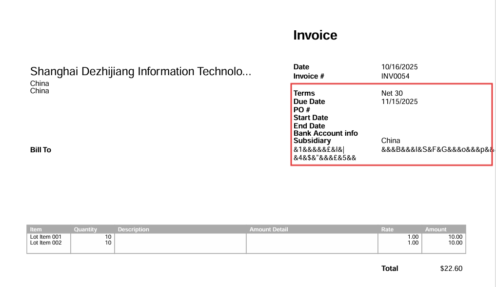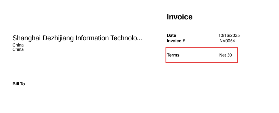 以上的设置都基本设置完成后,可以保存后预览,或者直接预览样式,Invoice打印预览时如下图所示,我们主要关注Terms的显示是否符合我们的设置。