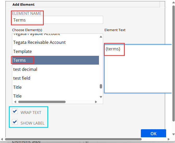 页面将跳出Add Element设置页面,在Element Name处输入显示的名称,然后选择要显示的信息Terms,看到带花括号的字段信息显示在右边Element Text处。