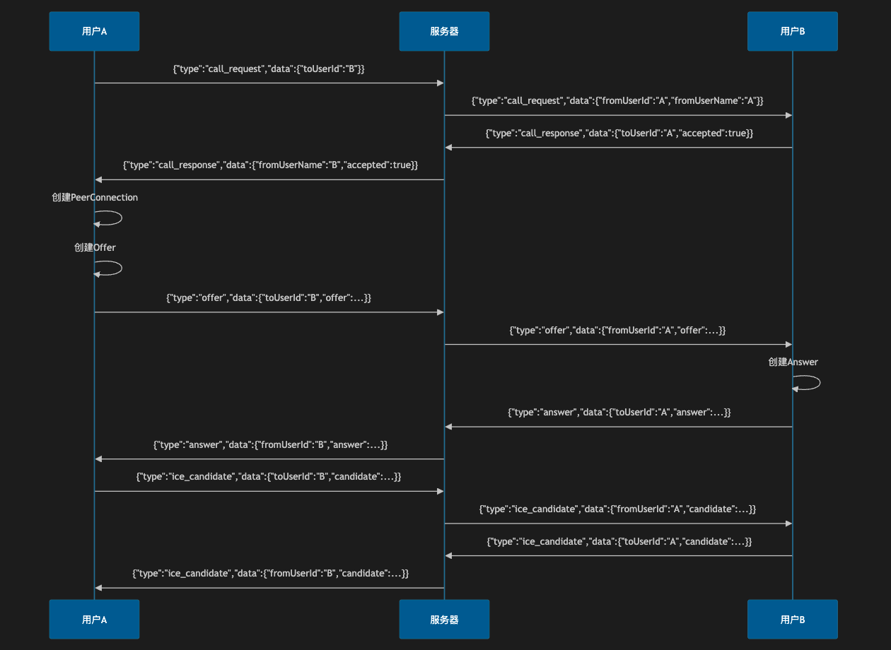 sequenceDiagramparticipant A as 用户Aparticipant S as 服务器participant B as 用户BA->>S: {"type":"call_request","data":{"toUserId":"B"}}S->>B: {"type":"call_request","data":{"fromUserId":"A","fromUserName":"A"}}B->>S: {"type":"call_response","data":{"toUserId":"A","accepted":true}}S->>A: {"type":"call_response","data":{"fromUserName":"B","accepted":true}}A->>A: 创建PeerConnectionA->>A: 创建OfferA->>S: {"type":"offer","data":{"toUserId":"B","offer":...}}S->>B: {"type":"offer","data":{"fromUserId":"A","offer":...}}B->>B: 创建AnswerB->>S: {"type":"answer","data":{"toUserId":"A","answer":...}}S->>A: {"type":"answer","data":{"fromUserId":"B","answer":...}}A->>S: {"type":"ice_candidate","data":{"toUserId":"B","candidate":...}}S->>B: {"type":"ice_candidate","data":{"fromUserId":"A","candidate":...}}B->>S: {"type":"ice_candidate","data":{"toUserId":"A","candidate":...}}S->>A: {"type":"ice_candidate","data":{"fromUserId":"B","candidate":...}}
