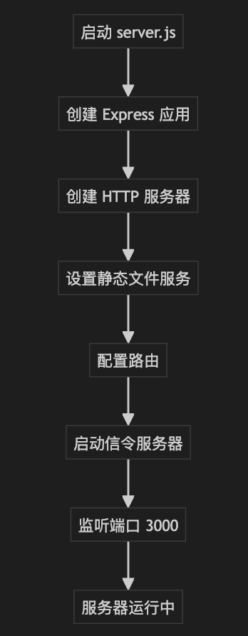 graph TDA[启动 server.js] --> B[创建 Express 应用]B --> C[创建 HTTP 服务器]C --> D[设置静态文件服务]D --> E[配置路由]E --> F[启动信令服务器]F --> G[监听端口 3000]G --> H[服务器运行中]步骤2:客户端连接