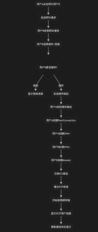 graph TDA[用户A点击呼叫用户B] --> B[发送呼叫请求]B --> C[用户B收到呼叫请求]C --> D[用户B选择接听/拒绝]D --> E{用户B是否接听?}E -->|拒绝| F[显示拒绝消息]E -->|接听| G[发送接听响应]G --> H[用户A收到接听响应]H --> I[用户A创建PeerConnection]I --> J[用户A创建Offer]J --> K[用户B处理Offer]K --> L[用户B创建Answer]L --> M[交换ICE候选]M --> N[建立P2P连接]N --> O[开始音视频传输]O --> P[显示对方用户信息]P --> Q[更新通话状态显示]🎯 关键技术点