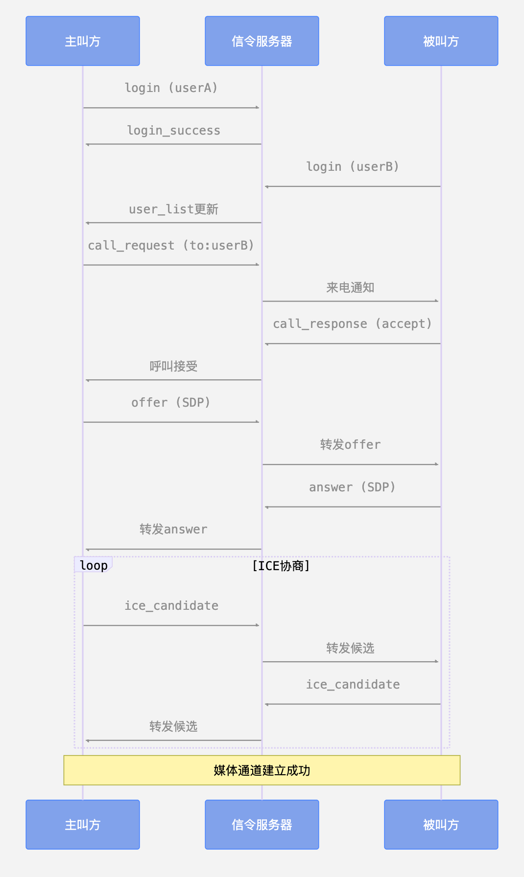 消息类型 方向 用途 关键字段 login C→S 用户登录 userName login_success S→C 登录成功 userId, onlineUsers user_list S→C 用户列表更新 users[] call_request C→S 发起通话 toUserId call_response C→S 通话响应 toUserId, accepted, fromUserName offer C→S WebRTC Offer toUserId, offer answer C→S WebRTC Answer toUserId, answer ice_candidate C→S ICE候选 toUserId, candidate hangup C→S 挂断通话 toUserId error S→C 错误消息 message 这个协议设计实现了信令服务器 + WebRTC的经典架构,既保证了实时性,又确保了系统的可扩展性和稳定性!