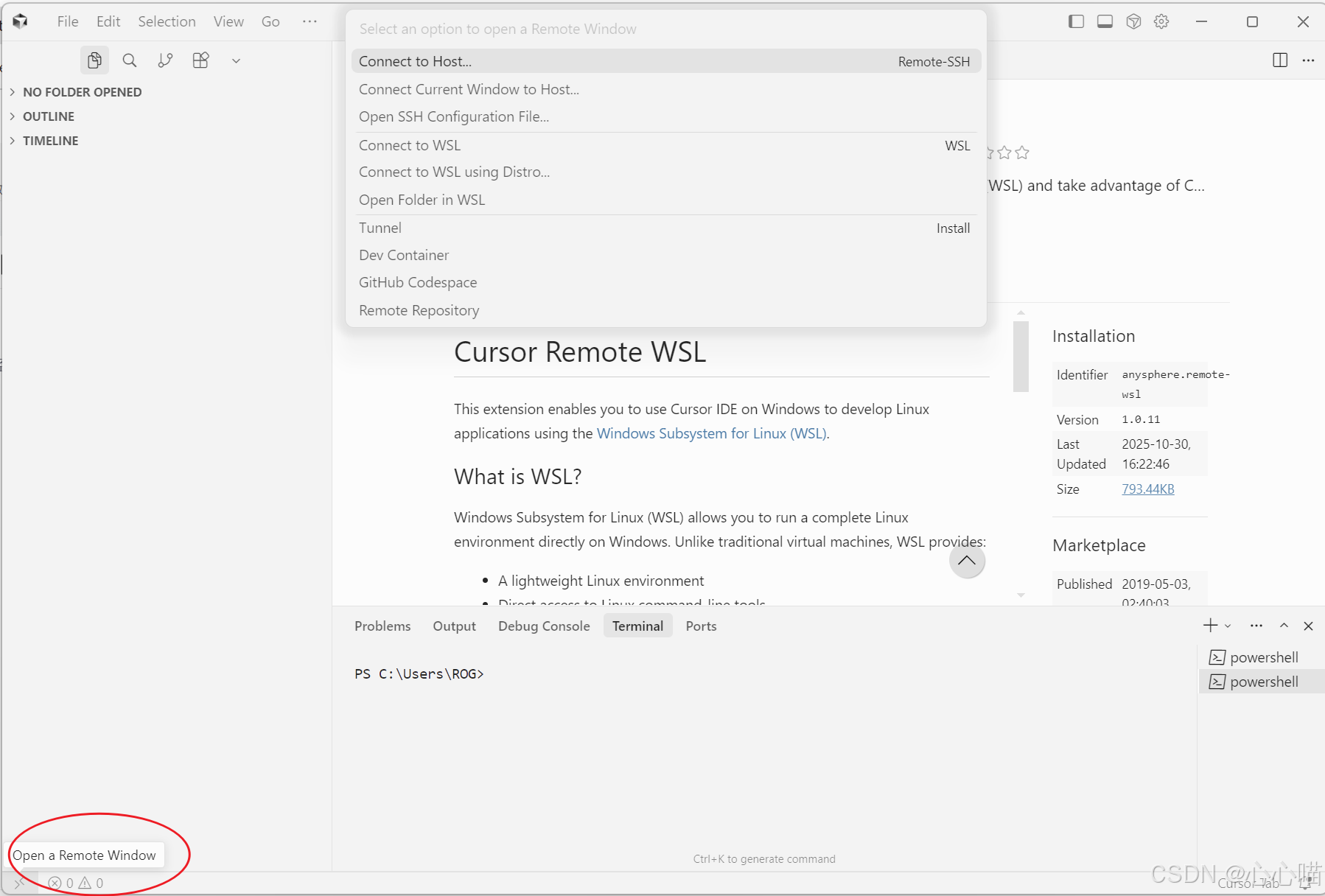 -  这样就会打开一个新的 Cursor 窗口,这个窗口已经连接到 WSL 环境