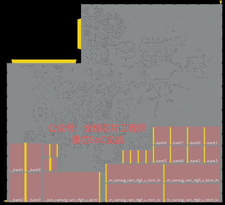 在partition阶段,进行初步的floorplan,划分电压域,并实现顶层的电源网络。如下图所示,整颗芯片包含两颗高性能cpu核,若干L2 $,一些常开模块和PMU模块等等。整颗芯片共划分了6个电压域。(顺便提一句,我觉得整个项目唯一美中不足的地方是顶层芯片没加PAD,景芯的另一个soc项目有加PAD的流程)