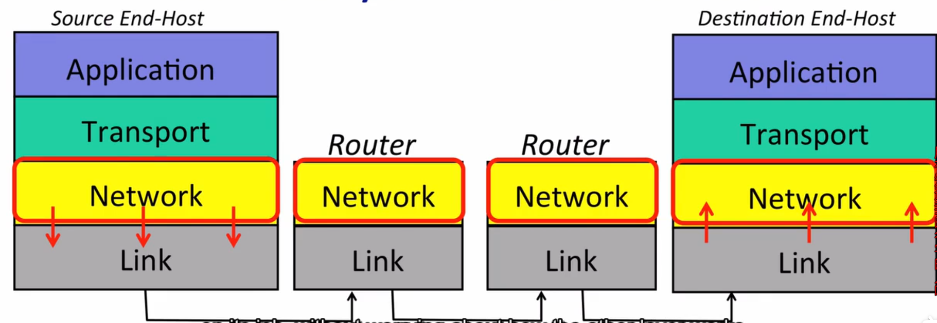 从一个路由器接受到数据包之后,将其数据链路层拆解,拿到其中网络层的信息,随后根据路由转发决定下一个去哪,包装其数据链路层,发送到下一个路由器。