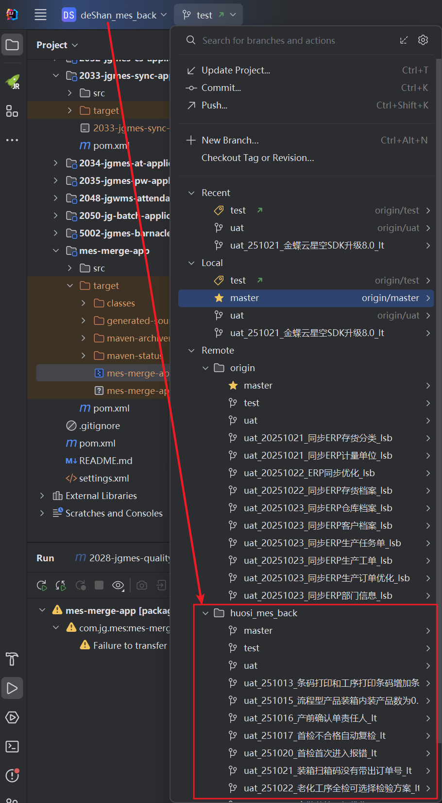 在idea中打开deShan_mes_back项目代码,打开分支,拉到最下面,会发现Remote下面多了一个huosi_mes_back远程仓库,而且huosi_mes_back 下面的分支都能看到了,可以直接将huosi_mes_back 下面的分支合并到deShan_mes_back仓库的分支了,跟本仓库的分支管理一样的方便。