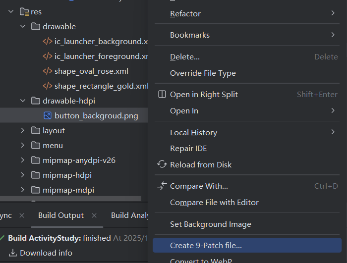 创建:在drawable中创建xml文件,根节点是selector。同上面shape创建方式一致,只有根节点的区别。主要用于设置控件样式。
