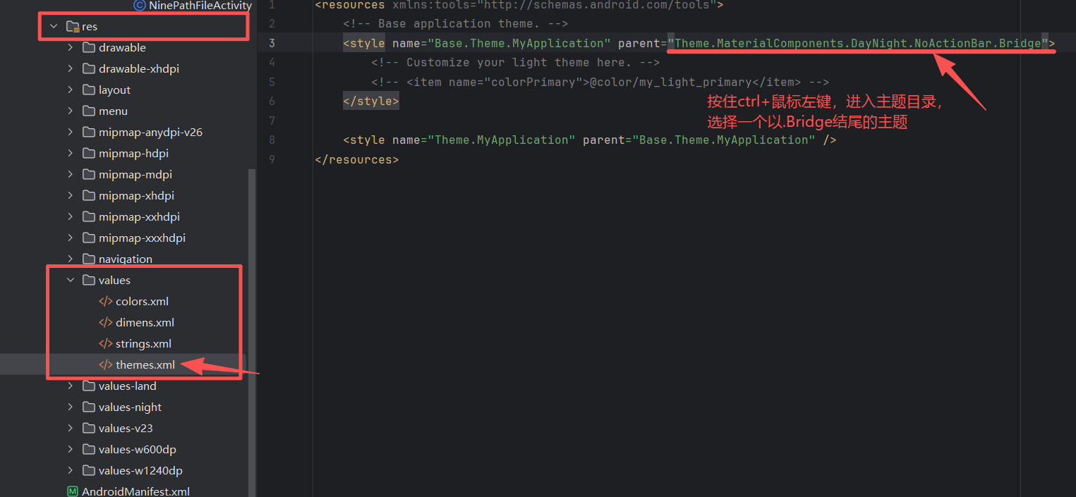 找到res->value->theme,修改为一个以.Bridge结尾的主题。如下图: