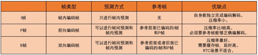 当然,有 IDR 这种特殊的 I 帧,也就有普通的 I 帧。普通的 I 帧就是指当前帧只使用帧内预测编码,但是后面的 P 帧和 B 帧还是可以参考普通 I 帧之前的帧。一般来说我们不太会使用这种普通 I 帧,大多数情况下还是直接使用 IDR 帧,尤其是在流媒体场景,比如 RTC 场景。只是说如果你非要用这种普通 I 帧,标准也是支持的。