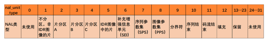 Type: nal_unit_type,占 5bits,表示 NALU 类型。其取值如下表所示。