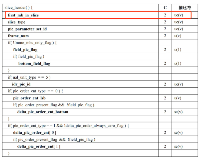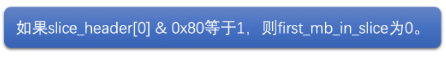 其中,first_mb_in_slice 是以无符号指数哥伦布编码的,需要使用对应的解码方式才能解码出来。但是有一个小技巧,如果只是需要判断 first_mb_in_slice 是不是等于 0,不需要计算出实际值的话,只需要通过下面的方式计算就可以了。