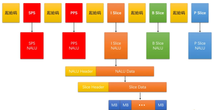 为了解决这个问题,H264 设计了 NALU(网络抽象层单元)。SPS 是一个 NALU、PPS 是一个 NALU、每一个 Slice 也是一个 NALU。每一个 NALU 又都是由一个 1 字节的 NALU Header 和若干字节的 NALU Data 组成的。而对于每一个 Slice NALU,其 NALU Data 又是由 Slice Header 和 Slice Data 组成,并且 Slice Data 又是由一个个 MB Data 组成。其结构如下: