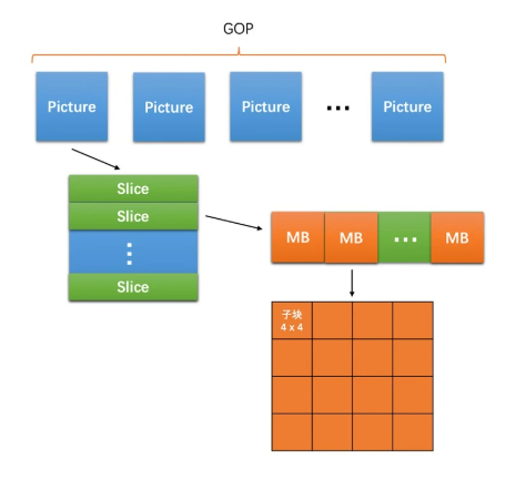 总结来说,图像内的层次结构就是一帧图像可以划分成一个或多个 Slice,而一个 Slice 包含多个宏块,且一个宏块又可以划分成多个不同尺寸的子块。如下图所示: