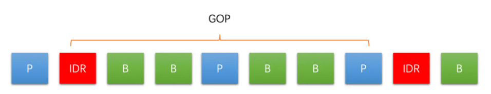 从一个 IDR 帧开始到下一个 IDR 帧的前一帧为止,这里面包含的 IDR 帧、普通 I 帧、P 帧和 B 帧,我们称为一个 GOP(图像组)。