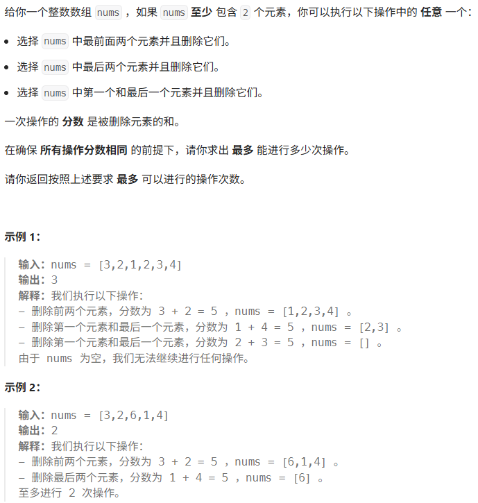 class Solution {private int[][] memory;private int maxOperations(int[] nums, int start, int end, int target) {//1.元素个数为1甚至更少时,无法进行操作,返回操作数0if (start >= end) {return 0;}//2.如果已经知道start到end需要多少次操作时,直接返回结果if (memory[start][end] != -1) {return memory[start][end];}//3.递归进行计算操作数int result = 0;//3.1删除前两个数result = nums[start] + nums[start + 1] == target ? Math.max(result, 1 + maxOperations(nums, start + 2, end, target)) : result;//3.2删除后两个数result = nums[end - 1] + nums[end] == target ? Math.max(result, 1 + maxOperations(nums, start, end - 2, target)) : result;//3.3删除前后两个数result = nums[start] + nums[end] == target ? Math.max(result, 1 + maxOperations(nums, start + 1, end - 1, target)) : result;//4.记忆化结果并返回return memory[start][end] = result;}public int maxOperations(int[] nums) {//1.初始化记忆数组为全-1memory = new int[nums.length][nums.length];for (int[] ints : memory) {Arrays.fill(ints, -1);}//2.记忆化搜索//2.1删除前两个数int result1 = 1 + maxOperations(nums, 2, nums.length - 1, nums[0] + nums[1]);//2.2删除后两个数int result2 = 1 + maxOperations(nums, 0, nums.length - 3, nums[nums.length - 1] + nums[nums.length - 2]);//2.3删除前后两个数int result3 = 1 + maxOperations(nums, 1, nums.length - 2, nums[0] + nums[nums.length - 1]);//3.返回结果return Math.max(result1, Math.max(result2, result3));}
