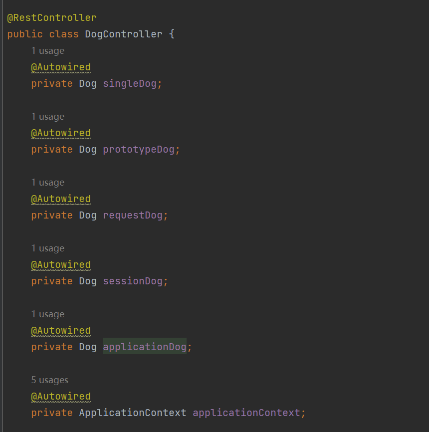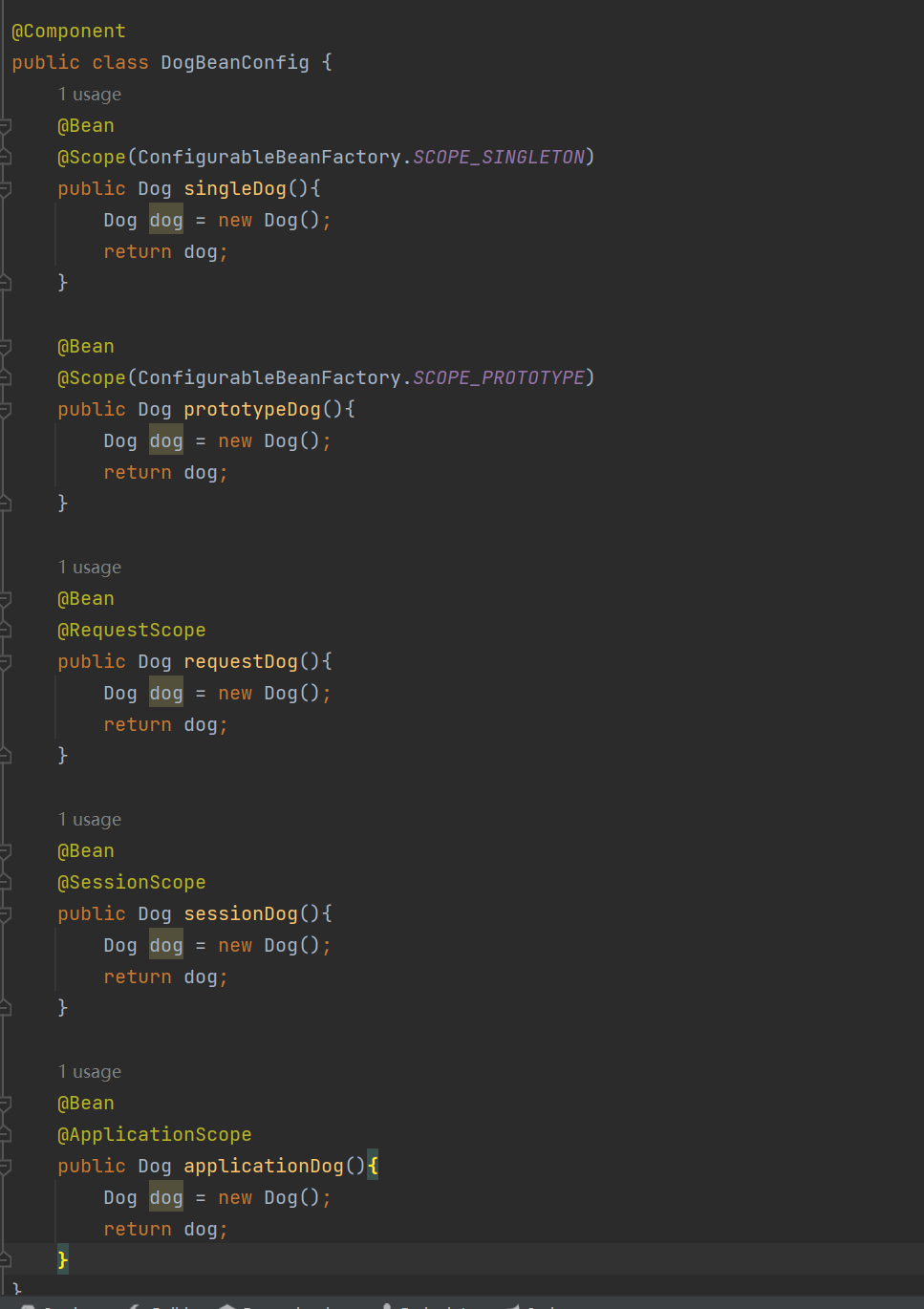 prototype: 原型作用域( 每次使用该 bean 时会创建新的实例)