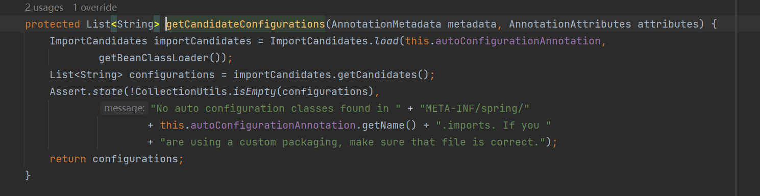 getAutoConfigurationEntry()方法通过调用 getCandidateConfigurations(annotationMetadata, attributes) 方法获取在配置文件中配置的所有自动配置类的集合