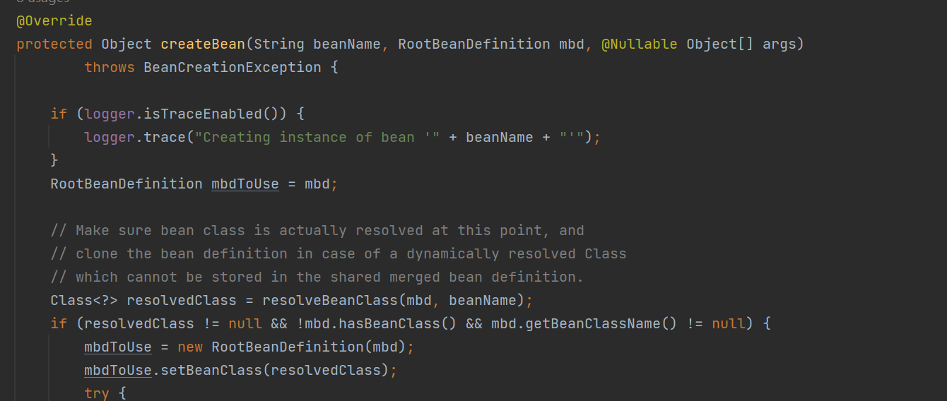 在这里创建 Bean,方法中包含了实例化,属性赋值,初始化过程
