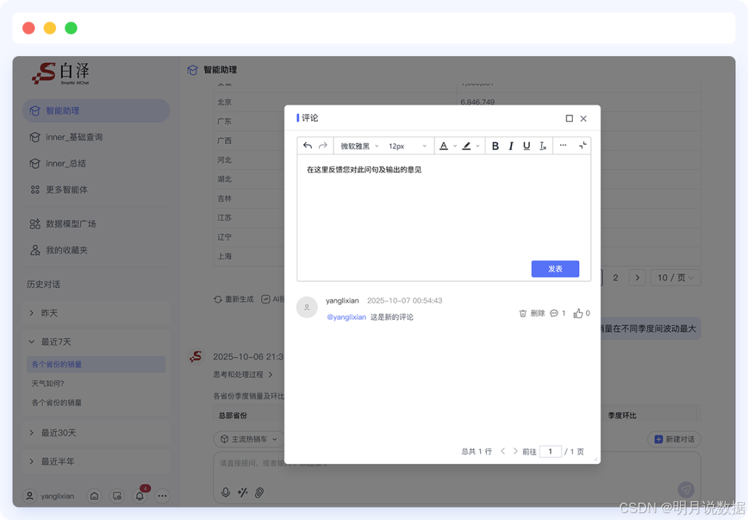 📌场景举例:数据分析师在AIChat查询“Q3 各产品销售额”时,发现结果与业务预期不符,通过“评论”反馈疑问后,运维人员立即回复排查进度,这样业务人员可以清晰查看当前的处理进度。