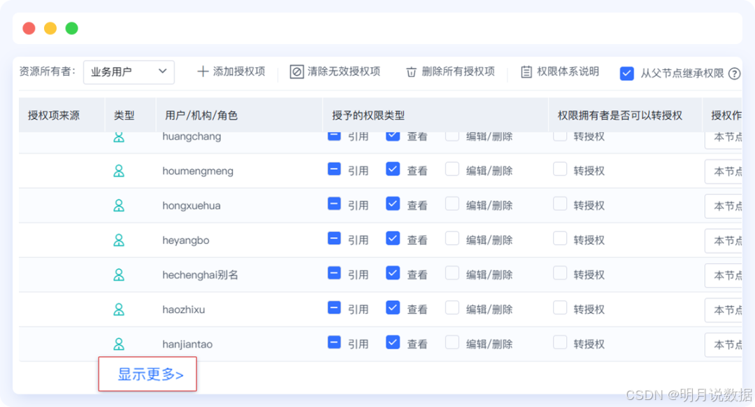 资源授权界面数据量大时,加载慢、甚至无法使用。新版本界面改为默认只展示部分数据,需更多数据时点击“显示更多”按钮,性能大幅提升,2000+条数据加载时间缩短至2秒。