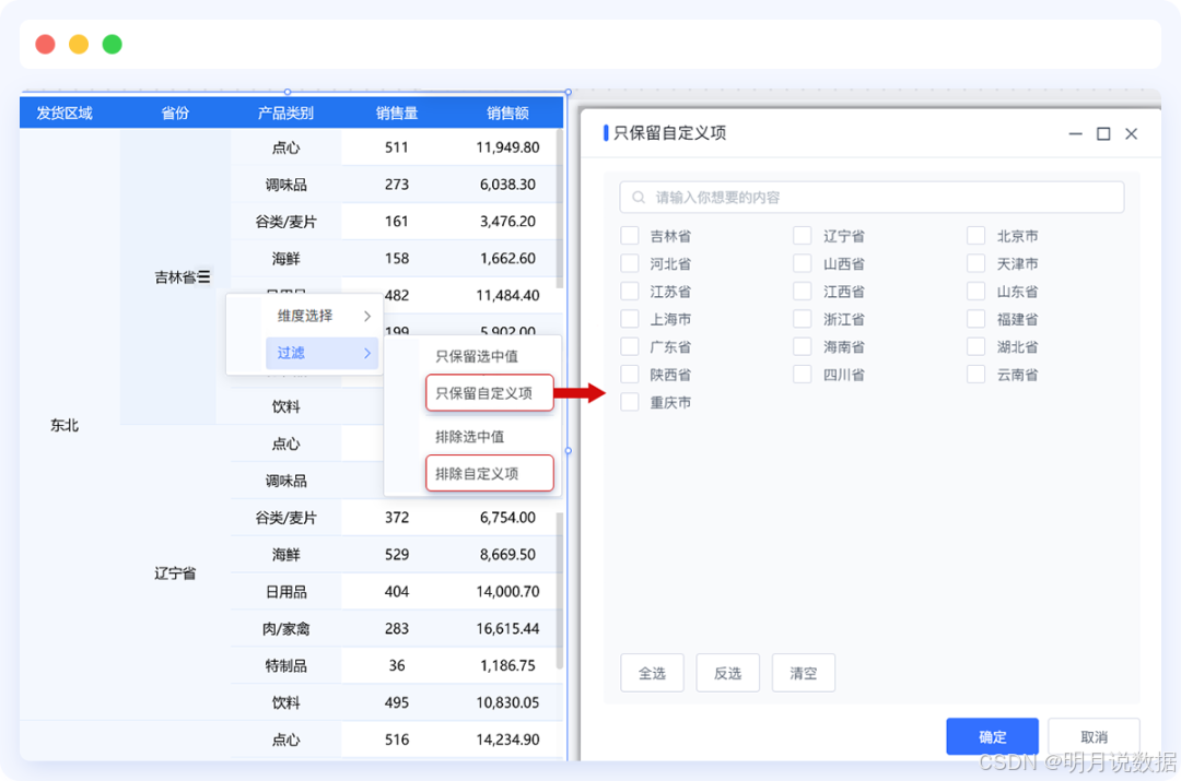 📌场景举例:以零售行业数据分析为例,若用户希望查看浙江省与广东省内各产品类别的销售对比情况,而相关数据因表格分页显示未出现在首页时,即可使用“只保留自定义项”筛选功能。通过勾选“浙江省”和“广东省”,系统能够立即过滤出这两个省份的对应数据,帮助用户迅速聚焦目标信息,优化分析流程。