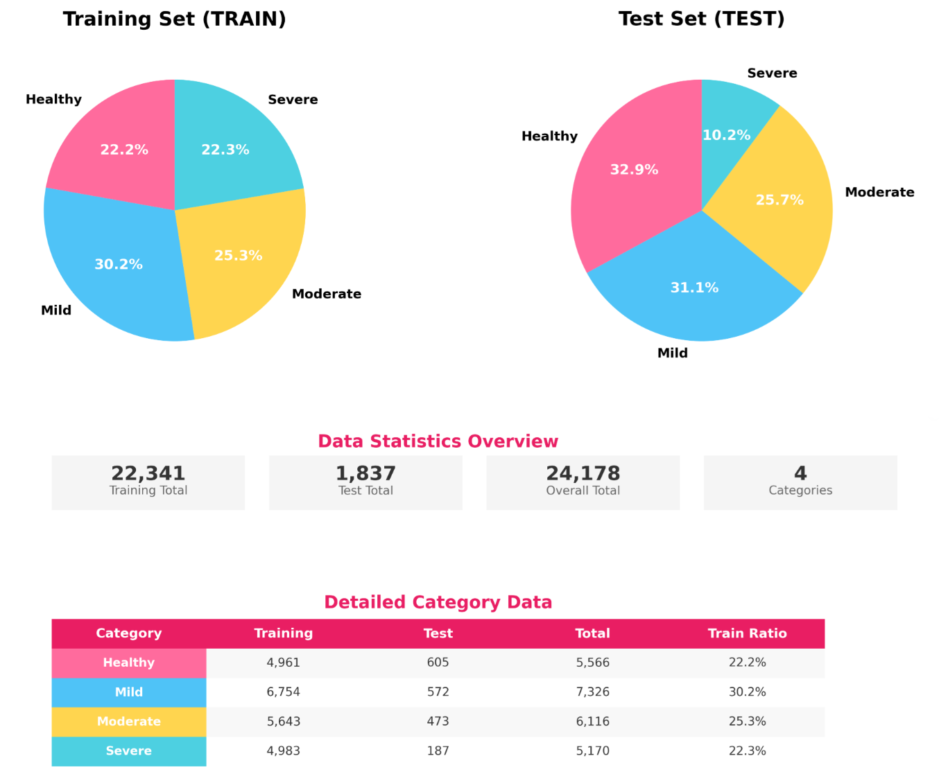 (2)数据结构:包含训练集与测试集,分为四类样本(健康、轻度、中度、重度)。