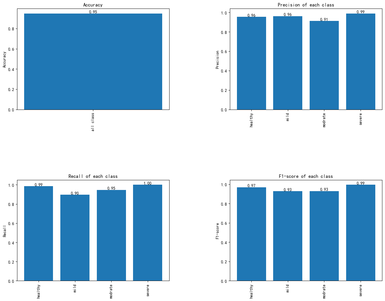 从图表中可见,模型表现优异,准确率为0.95,精确度超过0.90,严重类别精确度为0.99。召回率接近1,健康和严重类别为1,显示强大的识别能力。F1分数健康为0.97,其他类别均超过0.93,表明模型在各类别间表现平衡,具备强分类能力。