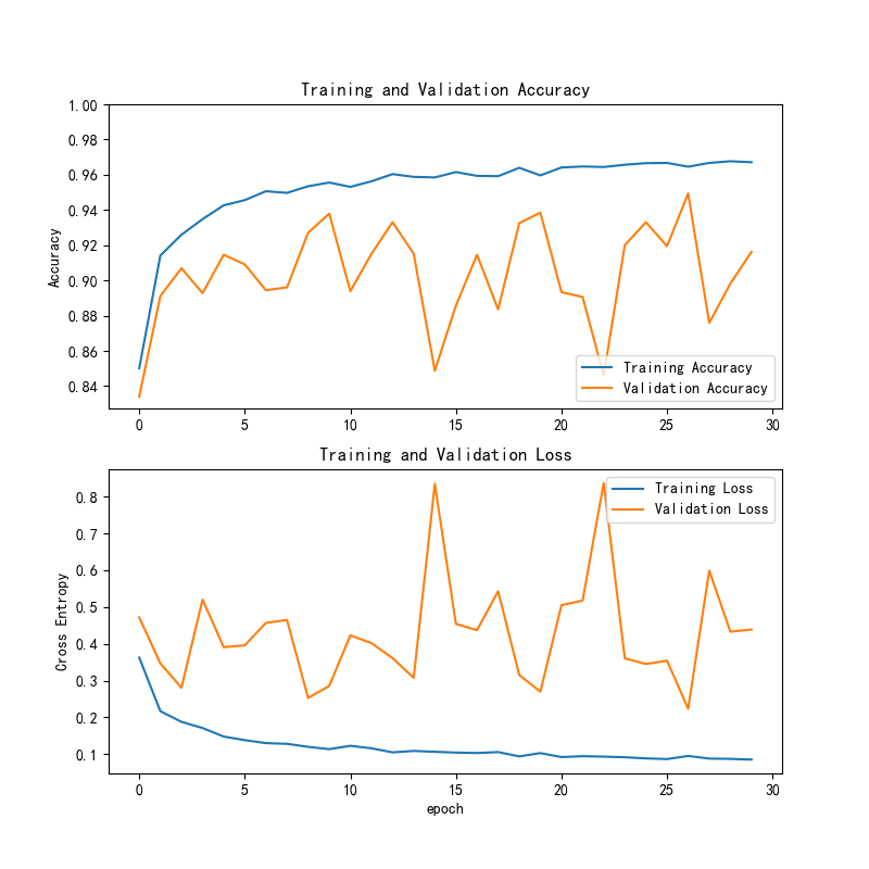 从图中可以看出,模型训练过程中精度稳步提升,验证精度逐渐稳定,表明泛化能力增强。训练损失持续下降,验证损失虽有波动,但总体改善,说明模型逐渐优化并具备较好的分类能力。
