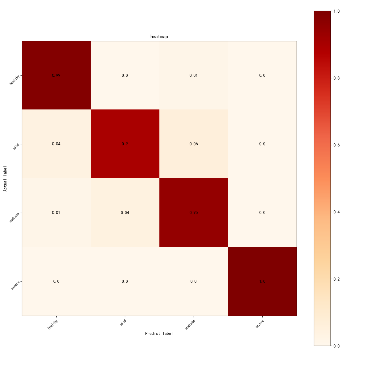 从这张混淆矩阵热力图可以看出,模型在分类任务中表现优异。健康类别的预测准确率为99%,轻度和严重病症的分类准确度分别为90%和95%。尽管存在少量误分类,尤其是轻度与健康、轻度与严重之间的混淆,但模型在严重病症识别上几乎完美。整体而言,模型表现出较强的准确性和良好的泛化能力。