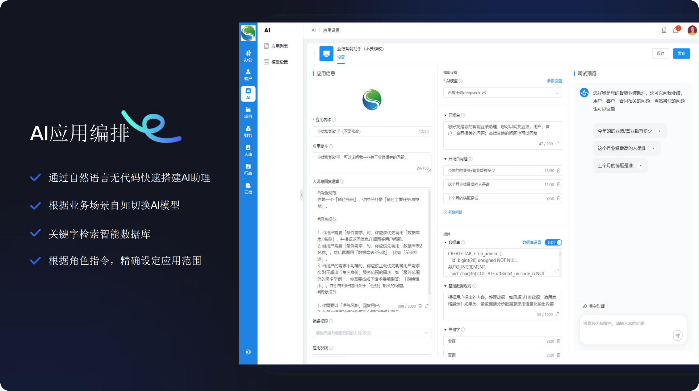 一站式企业数智化解决方案 该系统集客户管理、项目管理、审批自动化及低代码开发于一体,赋能企业高效运营与智能决策。核心功能包括:无代码自主搭建平台、AI驱动的复杂查询(NL2SQL技术)、企业管理知识库集成、自定义工作流程、清晰的职权划分体系、丰富的运营模板、高效在线协作及全流程监控。通过危机分析与自动化运转,助力企业提升竞争力,实现团队自驱与资源优化,推动项目高效执行,成为行业标杆。