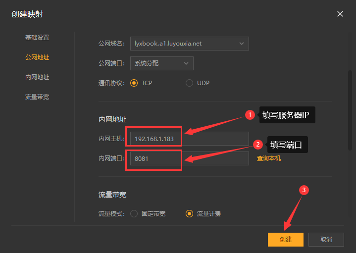 4,在内网主机填写你的服务器 IP 并且在内网端口里填写端口 8081 后点击【创建】按钮,如下图。