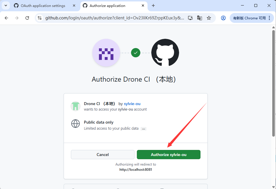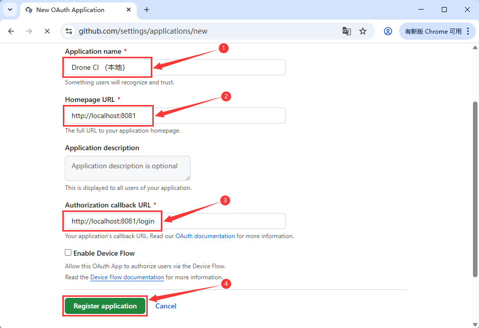点击【 New OAuth App 】,填写信息:Application name:Drone CI (本地) 、 Homepage URL:http://localhost:8081 、 Authorization callback URL:http://localhost:8081/login ,点击【 Register application 】。