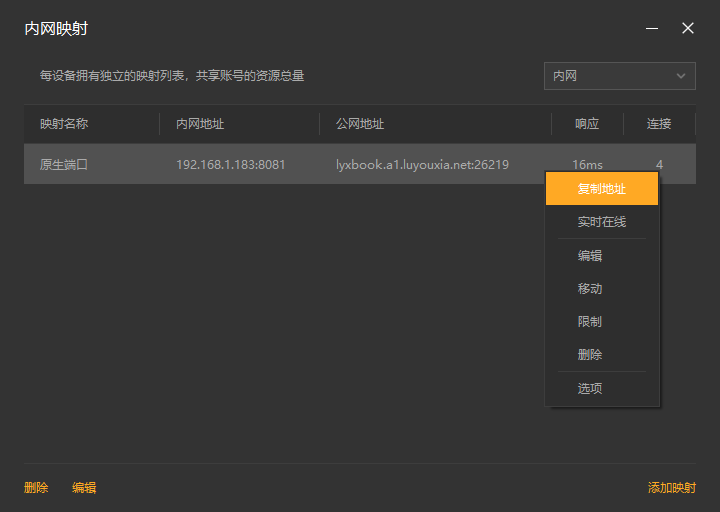 5,创建好后,就可以看到一条映射的公网地址,鼠标右键点击【复制地址】。
