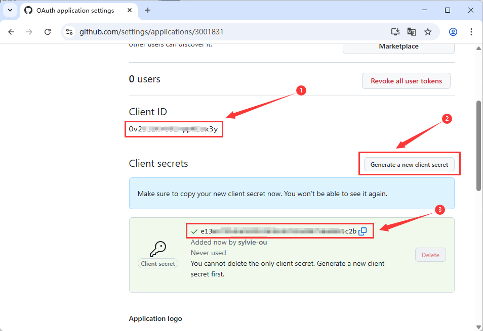 记下 Client ID 和 Client Secret(后面会用到)。