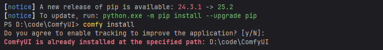 comfy install命令工作正常;- 并且检测到 ComfyUI 已经安装在