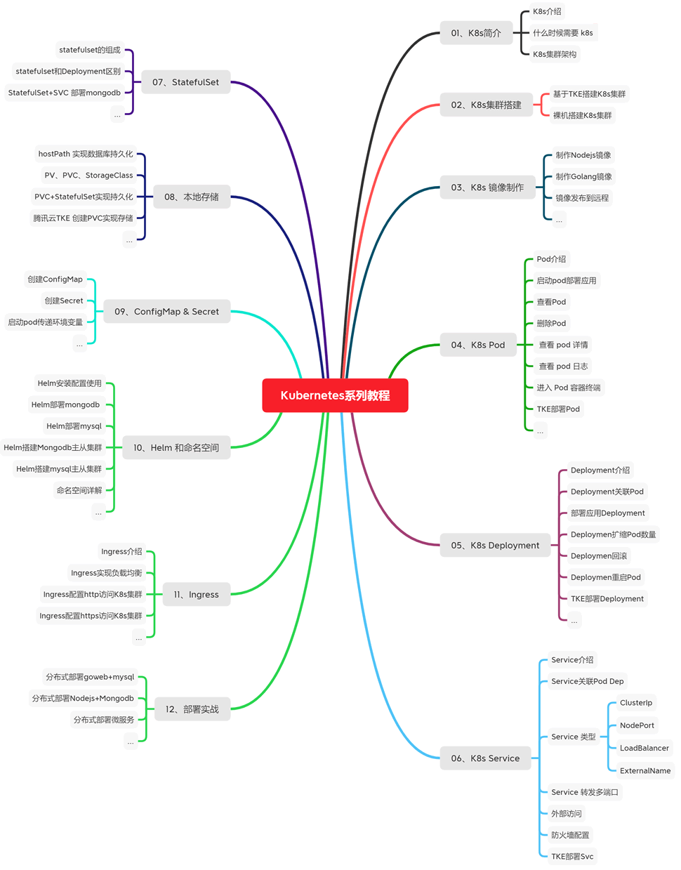 Kubernetes(K8S)系列教程涉及内容:从零开始讲了如何借助腾讯云TKE搭建K8s集群,如何使用原生服务器搭建K8s集群,手把手的讲解了K8s中的Pod、Deployment、StatefulSet、Service、PV、PVC、StorageClass、ConfigMap & Secret、Ingress等。从Golang和Nodejs镜像构建到分布式部署、从mongodb、mysql单数据库创建到mysql、mongodb主从集群数据库搭建都有详细讲解。从原生K8s命令部署到基于腾讯云TKE实战都有详细讲解。应用的版本升级&回滚、Pod扩缩容、多端口映射、Service ClusterIp NodePort ExternalName网络通信机制、 Helm 应用发布、应用配置分离、防火墙规则设置、多节点负载均衡、服务分布式部署都有详细讲解。
